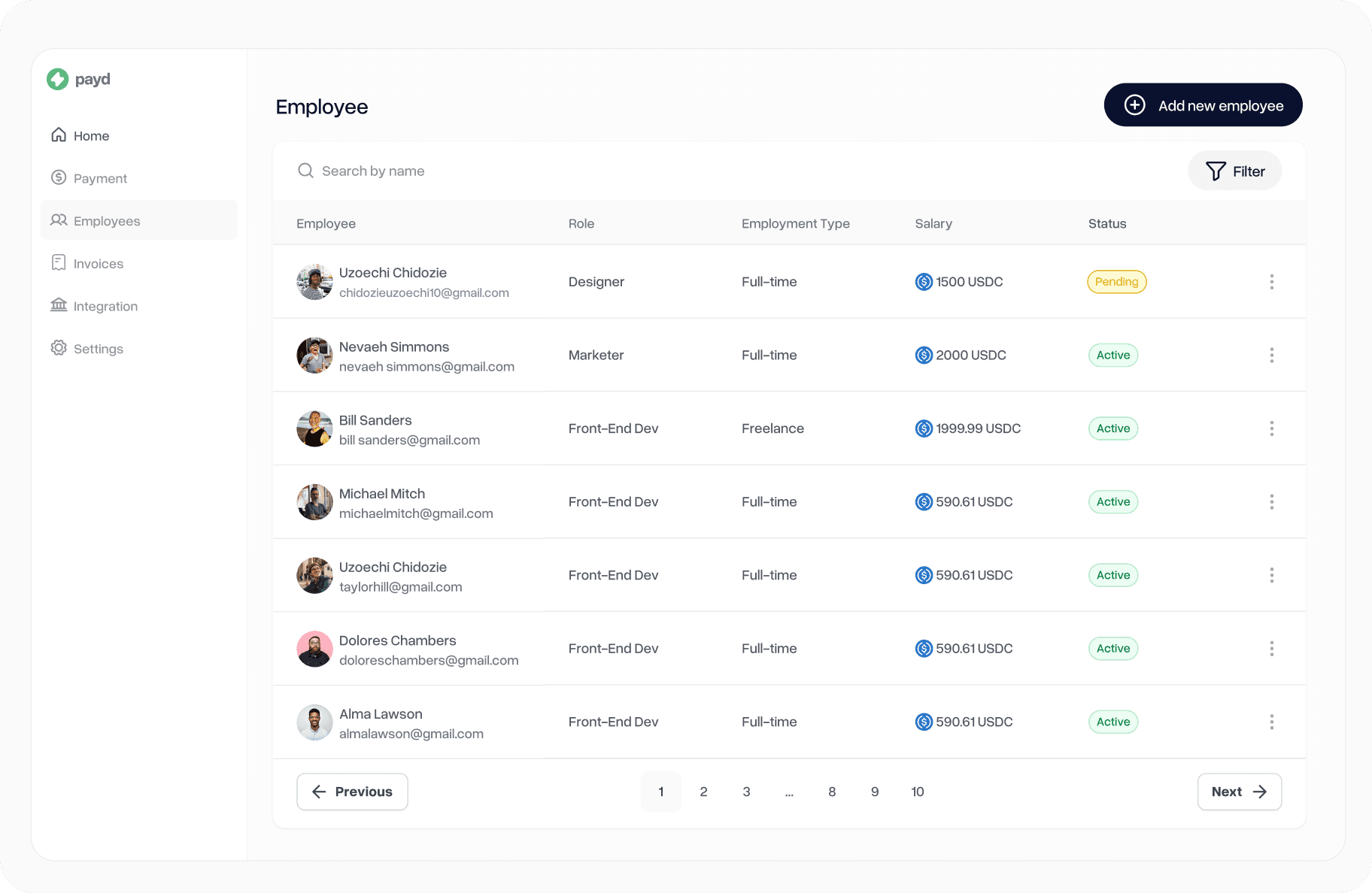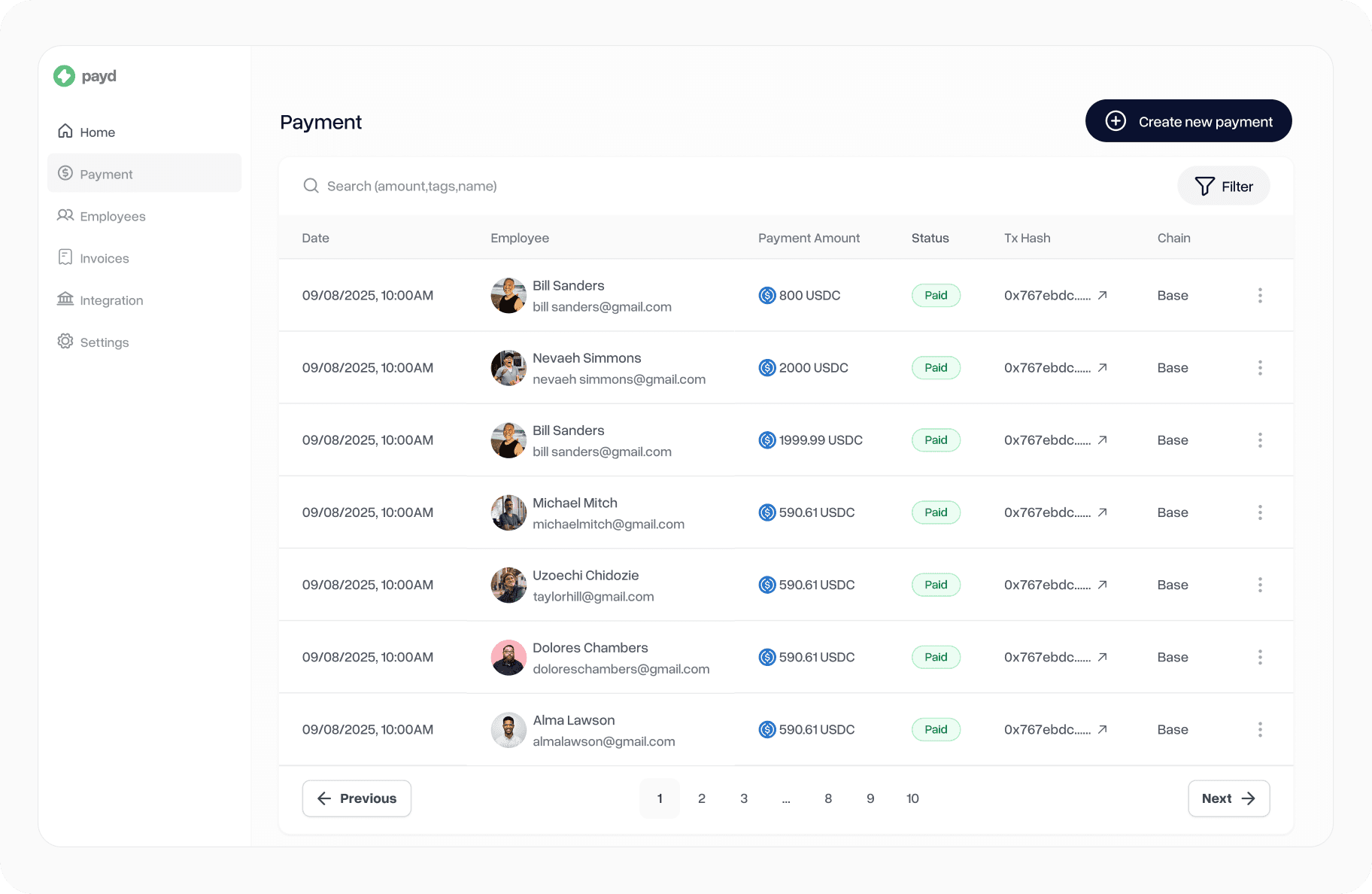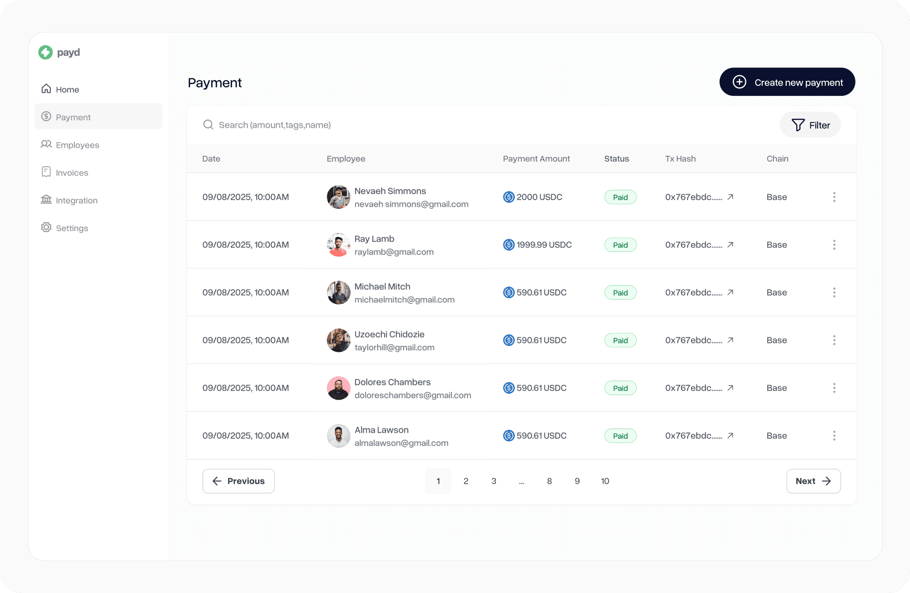 Payd lets employers add employees with a wallet address, fund payroll in USDC, and pay entire teams instantly. Employees receive USDC directly and can choose to hold or convert to local currency.