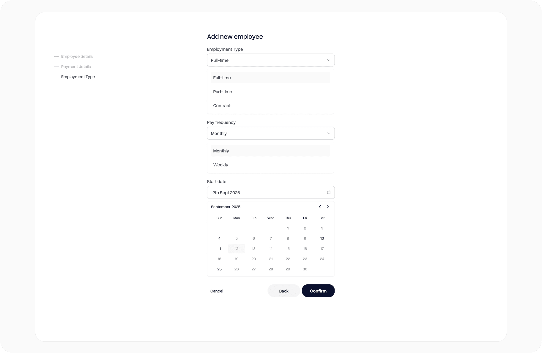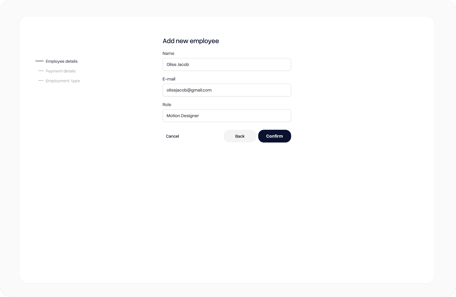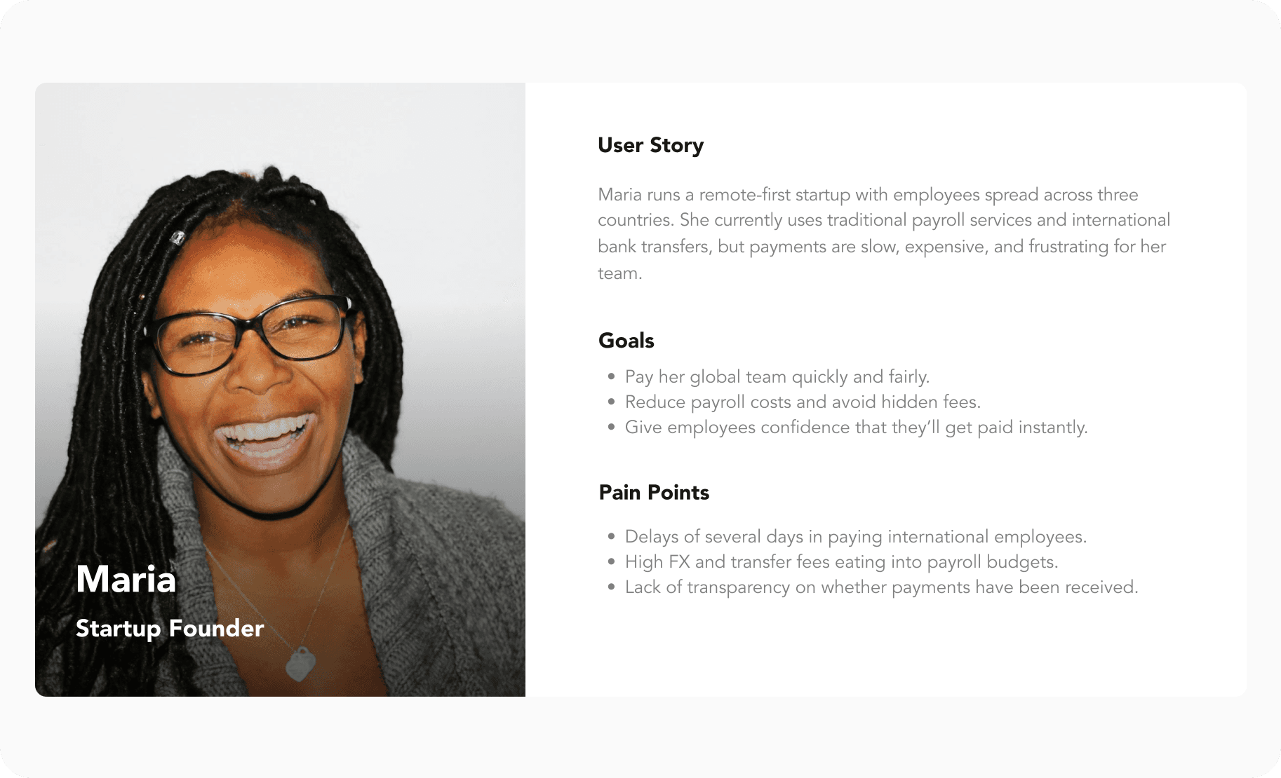 To ground the experience, I designed around a primary persona: Maria, a startup founder, manages a remote team across three countries. She wants to pay her team fairly and on time but struggles with international payroll systems.